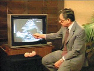 Audio de la película: Doctor viendo ecografía (voz doblada): Este es un registro de sectores de una imagen ultrasónica real de un niño nonato de doce semanas de edad. El niño está orientado en esta dirección (toma un muñeco y lo pone en posición horizontal). Ustedes pueden ver, con cierta claridad, la cabeza y el cuerpo que está aquí. Al ver más de cerca la imagen podemos distinguir el ojo o la órbita del ojo aquí. La nariz que está aquí y también la boca (señala con un puntero la pantalla). Y hasta podemos ver el ventrículo del cerebro aquí. Vemos el corazón latiendo en el pecho del niño. Pero ahora el abortista ha dilatado el cuello del útero y está introduciendo la punta de succión. Esta punta de succión que ustedes ven moviéndose violentamente hacia adelante y hacia atrás en la parte inferior de la pantalla es un instrumento letal que finalmente destrozará al niño. Podemos verlo moverse hacia el lado izquierdo del útero en un intento patético de escapar de los instrumentos inexorables que está usando el abortista para acabar con su vida. La punta de succión del abortista está atrayendo al niño en dirección hacia abajo. Debido a la presión negativa que le aplica ahora, está desprendiendo sistemáticamente el cuerpo de la cabeza.