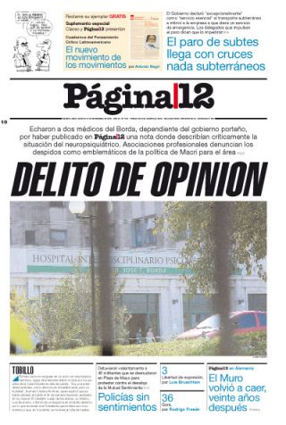 EL PAíS / NOTA DE TAPA › DOS PROFESIONALES DEL BORDA FUERON ECHADOS POR ESCRIBIR UNA NOTA EN PáGINA/12 SOBRE LA SITUACIóN DEL NEUROPSIQUIáTRICO