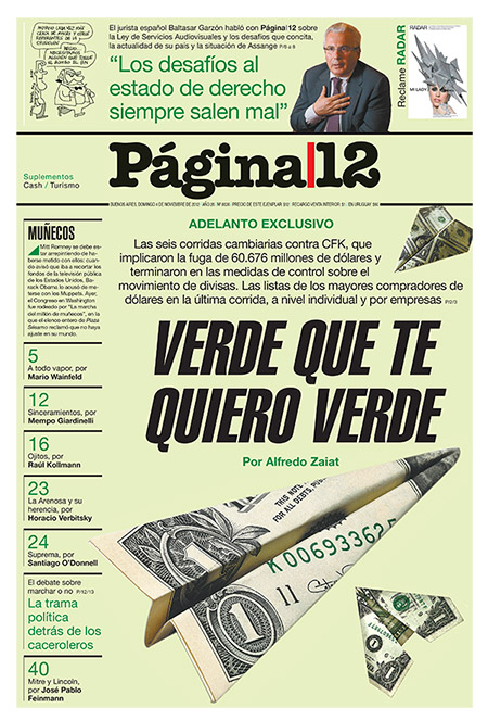 El país › ADELANTO EXCLUSIVO VERDE QUE TE QUIERO VERDEPor Alfredo Zaiat Las seis corridas cambiarias contra CFK, que implicaron la fuga de 60.676 millones de dólares y terminaron en las medidas de control sobre el movimiento de divisas. Las listas de los mayores compradores de dólares en la última corrida, a nivel individual y por empresas. |