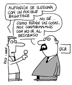 El país › Alfonsín consideró “un estímulo” el triunfo de Mestre en Córdoba Un inflador para el ánimo caídoTras el magro resultado que obtuvo en la primaria, Ricardo Alfonsín se apoyó en la victoria obtenida por el radicalismo en la capital cordobesa para sostener que “se puede pelear todavía por una segunda vuelta” en las elecciones nacionales. |