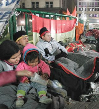 ”Mamá, yo no soy ciruja para dormir en la calle.” Magdalena, de 34 años, cuenta las dificultades que tiene su hija menor, Belén Orellana, de 7 años, para asumir la nueva realidad de su familia, compuesta además por su esposo y otra hija de 13. La novedad, dolorosa, es que duermen en la Plaza de Mayo, a metros de la Casa de Gobierno. A la intemperie, al pie de la Pirámide de Mayo, o cobijados bajo las recovas de los edificios que rodean el paseo público más famoso de Buenos Aires. No están solos. Son ochenta familias, argentinas, bolivianas, paraguayas y peruanas, que viven en la calle desde el 16 de mayo, cuando fueron desalojadas de madrugada por 300 policías. Los sacaron de las casas que ocupaban en un predio ubicado frente al Autódromo Municipal, del lado de la provincia de Buenos Aires, en la localidad de Villa Celina. “Las tierras son del IVC (Instituto de la Vivienda de la Ciudad) y por eso estamos pidiéndole una solución al jefe de Gobierno (Mauricio Macri), pero no nos recibe. Nosotros no nos vamos a mover de acá, hasta que nos den una solución.”