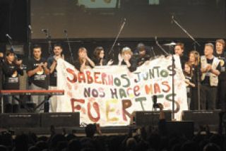 Mientras tanto en los camarines, Spinetta y Ricardo Mollo (voz y guitarra de Divididos) difundían el mensaje acorralados por las cámaras de tevé, al punto de estar uno sostenido sobre la espalda del otro. “Hay que desterrar la idea de que la vida no vale nada”, indicó Mollo. “Es una cuestión de decadencia en todos los aspectos, tanto en salud como en educación”, dijo el Flaco, como haciendo el coro. En varios momentos, ambos coincidieron al mencionar palabras como “conciencia” y “violencia”. Luego hablaron, de nuevo en simultáneo, sobre la letra de la canción escrita por Gieco (y publicada ayer en la tapa de PáginaI12) que cantaron músicos y familiares de la víctimas sobre el final de recital.