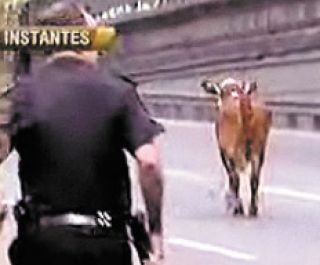 Más de un kilómetro a contramano por la autopista Perito Moreno. El bólido no era otra cosa que una ternera asustada y dispuesta al suicidio antes que caer en manos de un matarife. La ternera, de alrededor de doscientos kilos de asado y cortes varios, apareció a la altura del peaje del Parque Avellaneda nadie sabe cómo. Policías y empleados de AUSA tomaron por un momento la ingrata tarea de intentar dar caza a una vaca eludiendo sus cuernos y a los automovilistas. Media hora llevó la experiencia hasta que finalmente la pudieron atrapar mediante el antiguo método de chiflarle, gritarle “ey vaca” y decirle “mansita, mansita”.