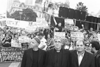 Por más que el locutor insistiera en que el acto de ayer contra la inseguridad era “apolítico”, los disertantes se empecinaron en contradecirlo. Salvo el representante de la comunidad islámica, tanto el rabino Sergio Bergman como el sacerdote Guillermo Marcó criticaron al gobierno nacional. El primero reprochó el adelantamiento de las elecciones, elogió el reclamo del campo y llamó a votar, indirectamente, “contra la hegemonía del Poder Ejecutivo”; el segundo coincidió en que el voto de la gente puede terminar con la inseguridad. Hubo unas 4 mil personas en el acto de la Plaza de Mayo, que evidenció una mezcla de reclamos parecidos con crímenes distintos, desde la abuela paqueta de Belgrano preocupada porque a su nieto le robaron el celular hasta un familiar de un chico muerto en una pelea de barrio del conurbano, pasando por el padre de Carolina Aló, asesinada de 113 puñaladas por su novio.
