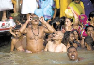 En la ciudad santa de Kurukshetra, en el norte de la India, un millón y medio de peregrinos hindúes se bañaron durante el eclipse en aguas consideradas purificadas, en busca de la liberación de su alma. También en la ciudad santa hinduista de Benares, la multitud celebró la reaparición del Sol levantando los brazos al cielo y lanzándose al río.