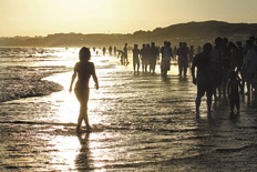 Pasando el mediodía, la Popular es definitivamente una versión marítima de la calle Florida. Para llegar a la orilla, más que esquivar, es preciso saltar sobre familias enteras, con sus heladeritas, mantas y juguetes de los chicos incluidos. El público, familiar en el sentido más extenso (y generacional: padres, abuelos, nietos) de la palabra, pareció generarse espontáneamente, en algún momento entre la mañana y la una. Y así, con ese énfasis, se arroja sobre las olas o las salta, o simplemente las contempla mate en mano. Tampoco por acá los vendedores de “barata la sombrilla” están con mucha suerte. En la Bristol, donde parece haberse logrado una mayor concentración de personas por metro cuadrado, la cosa mejora un poco, y también en las arenas más despejadas de Varese, explica un vendedor ambulante de bijouterie muy dorada y muy barata que prefiere no dar su nombre. ¿Teme tener problemas por falta de permiso? “No, la municipalidad nos deja trabajar. Es por las dudas, nomás.”
