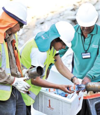 “Para colocar la Raise Borer tenemos que armar una base de cemento concreto de entre 60 y 80 metros cuadrados pero confiamos que ésta es la máquina que va a rescatar a los mineros. Cuando lleguemos a ellos los vamos a subir en una canastita”, comenta Jorge Sanhueza, de Codelco, al pie de la primera sonda. Cuarenta metros más arriba del lugar ya se ven los preparativos de la base. Al lado del micro que trajo al contingente de periodistas hay un enorme pozo con agua gris utilizada para hacer la mezcla del cemento. También están montados los tres carros con cuatro potentes reflectores para trabajar por la noche. “Aquí no se descansa hasta que los saquemos”, dice Sanhueza.