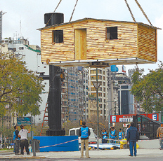 La ONG Un Techo para mi País levantó una vivienda de emergencia a 12 metros de altura en 9 de Julio y Juncal, donde cuatro voluntarios vivirán durante una semana. El objetivo es concientizar sobre la realidad de miles de familias a las que les falta un techo. La entidad solicita colaboración en la colecta del viernes y sábado próximo en las cajas de las sucursales de Easy, del Banco Hipotecario o en www.untechoparamipais.org/argentina.