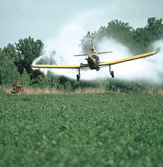 La aplicación aérea de productos como endosulfán y glifosato, según la norma, está prohibida en un radio menor a los 1500 metros y 500 metros, respectivamente, de la población urbana.