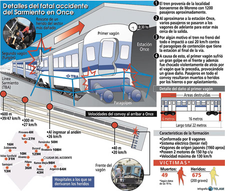 Imagen: EFE.La tercera mayor tragedia de la historia de los ferrocarriles argentinos sucedió en hora pico, a la vista de miles de pasajeros y quedó registrada por varias cámaras. Ocurrió ayer a las 8.32, cuando un tren de la línea Sarmiento chocó contra el tope de la estación terminal de Once. Murieron por lo menos 50 personas y 676 resultaron heridas. Según informó el secretario de Transporte de la Nación, la causa habría sido “un desperfecto con los frenos”. El maquinista, agregó Juan Pablo Schiavi, es un hombre joven, que estaba descansado y permanece en terapia intensiva. “A la altura de Caballito se notaba que desaceleraba demasiado antes de llegar a cada estación, como que no podía frenar y el tren iba repleto, vi gente lastimada por el piso, por todos lados”, contó Marcelo, un sobreviviente. Anoche, cientos de personas peregrinaban por los hospitales y las morgues. El gobierno nacional y el porteño declararon dos días de duelo y la Presidenta envió un mensaje de condolencia a los familiares de las víctimas.