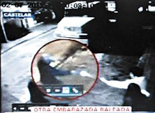 Videos de una cámara de seguridad muestran cómo un Chevrolet Corsa –que había sido robado en Merlo– pasó frente a la casa, antes de que un joven armado llegara a las corridas desde el lugar adonde iba el vehículo para increpar a la pareja. Sin embargo, el dueño de casa se resistió y empujó al asaltante, que reaccionó de forma violenta, con un disparo dirigido a la mujer, a quien hirió en una pierna, sin afectar su embarazo ni provocar riesgos para su salud. Sin perder tiempo, el asaltante, que luego declararía tener 17 años, corrió al auto donde lo esperaba su cómplice.