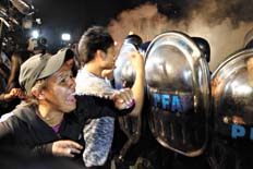 Cerca de las 19.30, la primera fila de policías mujeres fue sustituida por sus colegas varones que, al intentar avanzar, encontraron resistencia. “¡No me empuje, señora!”, sonó la voz del jefe del operativo amplificada por el altoparlante. Entre cámaras de televisión, cochecitos de nene y periodistas, la situación pareció congelarse hasta que, a las ocho menos diez, apareció un micro de larga distancia por un carril secundario. Los manifestantes se lanzaron a interceptarlo, uno incluso se arrojó al suelo para impedirle el paso. Pero, según pudo reconstruirse a posteriori, era una maniobra de distracción: los policías aprovecharon para ocupar la calle; dieron paso a un equipo de bomberos que apagó las fogatas, y opusieron un muro de escudos a los manifestantes así desplazados. El micro engañador se retiró y casi de inmediato la policía dio paso a una fila de ómnibus por el carril principal. El corte había sido levantado.