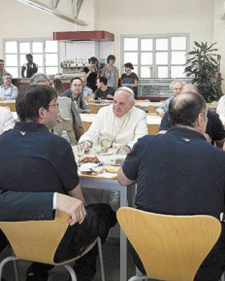 El papa Francisco compartió ayer el almuerzo con los empleados vaticanos en el comedor que usan a diario los trabajadores de la Santa Sede. Las imágenes de ese gesto fueron difundidas a través de Twitter por el diario L’Osservatore Romano. Según la información, Jorge Bergoglio fue al comedor industrial del Vaticano y almorzó en un mesa larga con unos diez trabajadores, entre ellos algunos obreros que vestían las camisetas azules de manga corta, uniforme oficial vaticano. En una de las imágenes se ve al Papa con una bandeja de plástico retirando el menú. Otra de las fotos lo muestra sentado junto a los trabajadores, conversando con ellos e incluso dejándose fotografiar. El menú fue pechuga de pollo con papas fritas y agua mineral.