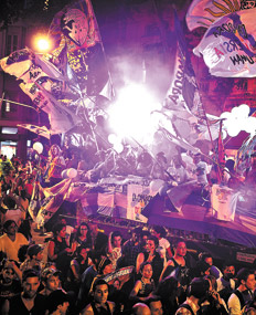 Allí, la joda había arrancado mucho más temprano. Grupos de amigos, parejas, compañeros; gays, lesbianas, travestis con sus mejores trajes, osos la colmaron de a poco, pero a ritmo constante. Para las 17 costaba el tránsito, que se descomprimía no bien nace la Avenida de Mayo. Los camiones/carrozas de las diferentes agrupaciones –el de la CHA comandaba, le seguían el de la Asociación de Travestis Transexuales de la Argentina (ATTA); el de la Asociación de Mujeres Meretrices de la Argentina (Ammar) y el de Visibilidad Lésbica, entre otros– esperaban sobre Hipólito Yrigoyen el inicio de la caminata a ritmo rave, que arrancó pasadas las 19.