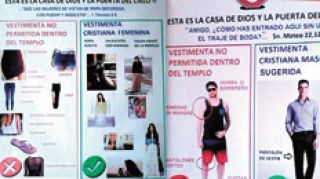 El cartel, aplicado sobre la puerta de la Iglesia San Isidro Labrador, de Zárate, se separa en dos áreas, la dirigida a la feligresía femenina y la de la masculina. “Vestimenta no permitida dentro del templo” y “Vestimenta cristiana femenina” son las dos divisiones del sector mujeres. En la primera se ve una minifalda, un short, un par de piernas con calzas, otro par con un tajo en la falda larga. Debajo, un torso con un escote y la leyenda “escotes, strapless, musculosas, puperas”, todas ellas claramente prohibidas. Tampoco están permitidas las ojotas y mucho menos las transparencias.