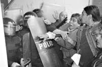 En menos de un minuto las vallas de hierro cayeron pesadamente y una treintena de policías de la Guardia de Infantería escapó hacia el interior del edificio. Los uniformados lograron cerrar una de las hojas del portón de hierro y el otro sector lo taparon con sus cuerpos. Se escuchó un disparo, al parecer una bala de goma que salió rumbo al techo. Detrás de los infantes de la policía se alinearon unos 12 agentes de la caballería, montados en lustrosos equinos que podrían haberse desbocado hasta provocar un desastre. Las cosas se fueron calmando y, una vez en la fiscalía, Cano, y sobre todo Banco, fueron objeto de las recriminaciones. “¡Callate! ¿Por qué no te vas?”, es lo mínimo que le dijeron al fiscal de la causa. Banco, después de bancarse todo, con transmisión en directo incluida, comentó con uno de sus colaboradores: “Voy a llamar a mi mamá, para que no se preocupe”.