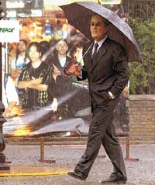 El agua de la lluvia que cayó en la mañana de ayer ante la Sociedad Rural –donde tiene lugar la COP 10– llegaba, por medio de una manga para incendios, desde un tanque ubicado en un trailer y subía por tres altos distribuidores de uso en cinematografía para caer, con total naturalidad, sobre el veredón, junto a un farol como el de la escena famosa de Cantando bajo la lluvia. El actor reclutado por Greenpeace vestía como Gene Kelly pero su cara era una máscara del presidente Bush. Un centenar de medios de prensa del mundo lo registraron bailando, empapándose; como telón de fondo podía verse la proyección de una foto de la esquina de Cabildo y Blanco Encalada y allí la gente con el agua a la cintura en la última inundación. “Bush baila bajo las crecientes lluvias en la Argentina y el mundo, representando la actitud aislada e inmoral de su administración al mantener, en la COP 10, su negativa a adherir al protocolo de Kyoto”, comentó Juan Carlos Villalonga, representante de Greenpeace. En cuanto a las medidas anunciadas por Estados Unidos para disminuir sus emanaciones de gases con efecto invernadero, el ambientalista afirmó que “al plantearse por fuera del protocolo, quedan al margen de todo contralor, verificación o garantía”. Ese país y Australia son los dos grandes refractarios al protocolo, que entrará en vigencia el 16 de febrero.