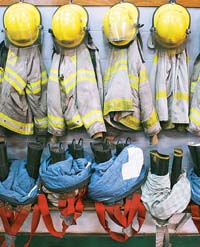 Bomberos con uniformes colgados