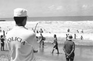 Hugo está parado a lo SWAT: brazos cruzados y cara de perro. No está de custodio en una disco, ni en la cabina de un banco. Fue contratado hace unos días como parte del grupo de seguridad que anda de cortos en los balnearios. La protección intrabalneario esta vez tiene inversiones como una superproducción de Hollywood. Los balnearios ya no ofrecen sólo carpas, sogas y el riguroso cordón de corral limitando terrenos. Ahora también ofrecen combos con las promo de custodios y hasta un set completo de cámaras anti-chorros. Las cámaras se están instalando entre las carpas alquiladas en Playa Grande, el único barrio de esta ciudad donde los precios que en todos lados bajaron, aumentaron 20 por ciento. La exhibición es una política de seguridad, y de clase. Los equipos con cámaras son monitoreados durante todo el día desde una pequeña cabina y repiten las tendencias de moda en las grandes ciudades. Esta corriente que empezó frente al Galana está replicada de algún modo en los balnearios donde las playas populares se chocan con las privadas.