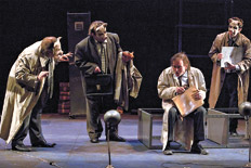 Mientras los espectadores ocupan las butacas de la Sala María Guerrero, una voz femenina en off solicita mantenerse a la espera: “En estos momentos, todos nuestros agentes están ocupados”. Si bien el destinatario no es el espectador necesitado de una pronta respuesta, la grabación anticipa una de las líneas por las que transita El régimen del pienso, obra que La Zaranda Teatro de Andalucía La Baja ofrece (hoy es la última función) en la sala mayor del Teatro Nacional Cervantes. La espera es aquí la del cesanteado, eterno mendigo de su indemnización en un sistema donde prosperan las metamorfosis. El humano puede acabar en cerdo, forense, artista o burócrata. Sólo que en ese enredo el deseo no cesa, y menos cuando la pretensión es ser realmente libre, acaso por considerar a la libertad sustento real y metafísico de la ética y el arte.