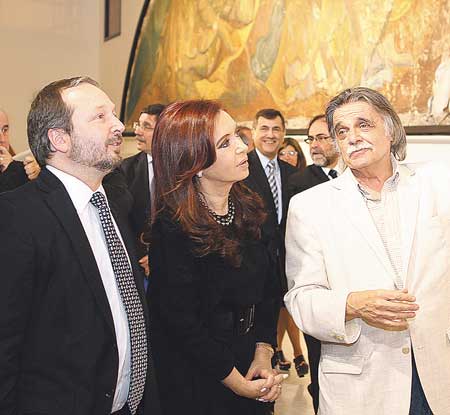 La Presidenta atravesó el museo y llegó al escenario, en el jardín. Junto a ella subieron el ministro de Educación, Alberto Sileoni; el secretario de Cultura, Jorge Coscia; el secretario general de la Presidencia, Oscar Parrilli; y el secretario de Legal y Técnica, Carlos Zannini. Todos se sentaron, junto a González, De Vido, y la Presidenta, a una mesa. Detrás suyo se ubicaron Sabbatella, el jefe de la Secretaría de Inteligencia Héctor “Chango” Icazuriaga, y la socióloga y ensayista que dirige el museo, María Pía López.
