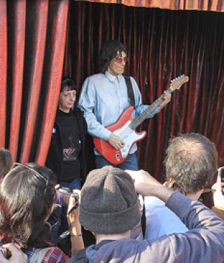 Efecto: un pequeño tumulto erosiona el paisaje natural de Triunvirato y Roosevelt, cualquier sábado a la tarde. Causa: una cantidad más o menos proporcional de celulares, máquinas fotográficas y personas, a su vez causa de tal tumulto, pugna por acceder a sacarse una foto al lado de una figura inmóvil, levemente sonriente. De una escultura que recién se acaba de descubrir y tiene una guitarra rojiblanca colgada al hombro, lentes púrpura transparentes, mirada zen y melena al hombro. De espaldas, algunos músicos tratan de recordarla en vida. Belén Ice, a través de hermosas canciones como “Ella también” o “Esta es la sombra”, o el joven cantautor Ignacio Arigós, con un mix que va de “Entonces es como dar amor”, de Spinetta Jade, hasta “El Marcapiel”, en clave unplugged, y desemboca en una nítida versión de “Cuando el arte ataque”. Ambos, apenas acompañados por una guitarra, le ponen el sonido preciso a la situación. Transforman al ínfimo escenario en una especie de fogón urbano, a la luz del sol y rodeado de curiosos.