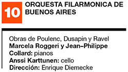Con dirección sensible y atenta de Diemecke, que supo entrar en el mundo estético particular de cada una de las composiciones –y, tal vez lo más difícil, salir luego de él–, la orquesta brilló en cada una de sus secciones y fue cómplice, también, del riesgo. La ovación recibida después de cada una de las tres obras demostró, a las claras, que músicos y público están más que dispuestos a salir de los lugares comunes y a internarse en universos expresivos diferentes e, incluso, desafiantes. La primera parte del concierto estuvo dedicada al brillante Concierto para dos pianos y orquesta de Francis Poulenc, con la chispeante actuación de Marcela Roggeri y Jean–Philippel Collard como solistas. La segunda abrió con “Celo”, el primer concierto para cello y orquesta de Pascal Dusapin, con la memorable participación de Anssi Karttunen; el cierre fue con la terrorífica espectacularidad de La valse, de Maurice Ravel.