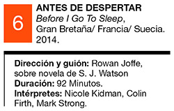 Los puntos de contacto con Memento son evidentes. El opus dos de Joffe –hijo de Roland Joffe, mucho más conocido por acá a partir de su película de 1986 La misión, rodada en la provincia de Misiones– es un thriller paradójico hasta en su título en castellano, que se opone al original en inglés (Before I Go To Sleep: Antes de irme a dormir). Por un lado logra un puñado de aciertos, entre ellos la articulación de una trama intensa de misterio que consigue sostenerse durante gran parte de los 90 minutos que dura el relato. Otra es la elección del punto de vista de Christine como centro narrativo, obligando así al espectador a saber tan poco como ella. El casting ofrece uno de los puntos altos de la producción, rodeando a la efectiva Kidman con dos grandes actores como Firth y Mark Strong, permitiéndose jugar con las posibilidades que ofrecen sus physique du rôle. Pero Antes de despertar es una de esas historias que para ser eficaces necesitan contar con un mecanismo narrativo perfecto, algo que sobre el final dista mucho de ocurrir. Lejos de la cuidada tensión con que se ha desarrollado la trama hasta ahí, el cierre es desprolijo, efectista y con unas cuantas arbitrariedades, cometiendo la torpeza de confundir brutalidad con fuerza y sensiblería con sensibilidad.