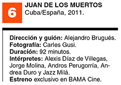 Con tres años de retraso se estrena esta verdadera rareza. Comedias de zombis hay montones. Pero, ¿cubana? Eso sí que no entraba en ningún cálculo. Más aún considerando que no tiene nada que envidiarle (ni narrativa ni técnicamente, ni en el terreno de la digitalización y efectos especiales) a ninguna de sus pares de cinematografías poderosas. ¿Escrita y dirigida por un argentino? Sí, el treintañero Alejandro Brugués, radicado allí desde hace rato y con varios largos en su haber. Si todo eso suena raro, ¿qué decir de una comedia de zombis cubana que es seguramente la película más irritativa para el gobierno revolucionario que se haya producido en vaya a saber cuántos años? Apenas un giro final que apunta a correrla del terreno del escepticismo y el cinismo, haciendo de un pícaro un mártir, le baja el promedio a este pequeño hallazgo tropical. Dejando de lado esa aflojada, y aun no siendo perfecta, Juan de los muertos es un muy recomendable splatter caribeño en joda.