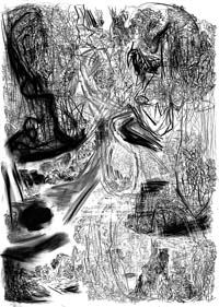 Por momentos el dibujante pone todo y el resultado es una sobrecarga de trazos, huellas y líneas. Por momentos, sin embargo, se abisma en la nada, en espacios vacíos, zonas en blanco y en silencio.