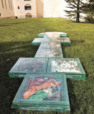 En la salida del edificio principal hacia un jardín interno, Malala Lekander fabricó una rayuela de vidrio, De la tierra al cielo, colocada sobre el pasto, en cuyo interior hay desechos encontrados en el piso.