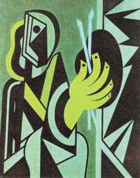 Muchas veces, la línea del horizonte cruza el plano de la pintura, generalmente detrás de la forma, por lo que ésta parece existir en el espacio. Este espacio es de color, casi siempre plano; raramente, como en Pájaro, con una sombra. En Pájaro, como en las torres, la forma gana solidez con el cuidadoso degradé tonal de un mismo color en segmentos verticales que van de oscuro a claro.