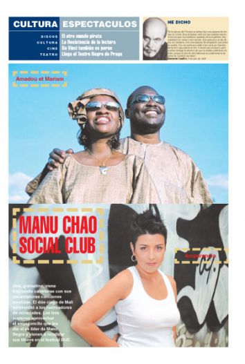 Amadou et Mariam, Amparanoia: Una, granadina, viene trajinando carreteras con sus encantadoras canciones mestizas. El dúo ciego de Mali sorprendió a los rastreadores de novedades. Los tres supieron aprovechar el empujoncito que les dio el ex líder de Mano Negra y vienen a revalidar sus títulos en el festival BUE.