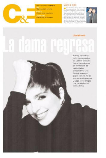 Liza Minnelli Actriz y cantante de culto, la protagonista de Cabaret sobrevive desde hace décadas en un mercado de celebridades descartables. “A la hora de evaluar un papel, siempre me fijo primero en el personaje y luego en los amigos que trabajarán a mi lado”, afirma.