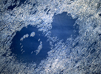 CRATER Y LAGO KARA-KU.En un rango de tamaños similar al Gosses Bluff, ahora nos encontramos con dos antiquísimos cráteres hermanos, en Québec, Canadá. Son dos fosas circulares, originadas por un doble impacto ocurrido hace unos 290 millones de años. Y que ahora –y vaya a saberse desde cuándo– se han disfrazado de grandes charcos helados: el lago Crearwater Oeste y el lago Crearwater Este, de 32 y 22 kilómetros de diámetro, respectivamente. Un detalle, por demás curioso, es ese anillo de “islas” que afloran de las aguas del mayor, y que seguramente se originaron a partir del “rebote” de materiales de la corteza terrestre, durante la formación del cráter.