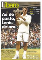 LIBEROLunes, 9 de julio de 2012 AS DE PASTO, TENIS DE OROEl truco le salió bien a Roger Federer, que con su séptimo título en Wimbledon volvió a convertirse, a los 30 años, en el mejor tenista del mundo. Venció al escocés Murray en cuatro sets e igualará el record de Pete Sampras al frente del ranking mundial.