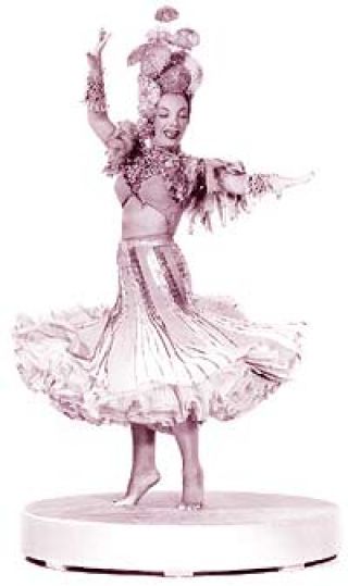 Había en ella –como en la picante Mae West– algo de autoparodia, de reírse de ella misma y de los que la rodeaban, que ha hecho que con el tiempo su figura –tan popular en su década de apogeo– crezca en el aprecio de nuevas y nuevos admiradores que la han descubierto a través del disco, el video, alguna proyección por cable. Como por ejemplo la de The Gang’s All Here, vista hace algún tiempo, con números musicales tan desaforados (estaba Busby Berkeley detrás de la cámara) como ese en que Carmen hace “The Lady in the Tutti-Frutti” entre dos filas de frutillas gigantes. Ella misma tocada con un monumental sombrero de bananas, que cuando se aleja la cámara, termina superándola en tamaño. Un cuadro surreal y tropical que prosigue en las escenas de (pretendida) vida cotidiana: Carmen duerme con un peinado prolijamente complicado y un camisón brotado de voladitos multicolores. Por la mañana, para coquetear con un empresario calza traje largo ajustado verde manzana, con incrustaciones doradas en diagonal y flecos sedosos que subrayan sus andares ondulantes, el pelo a todo volumen con adornos al tono y enormes aros centelleantes. Nada, desde luego, que pudiera opacar ni la luz de sus expresivos ojos picarones que acompañaban el frenesí de su ritmo cuando danzaba, ni su manera de fruncir una boca naturalmente pulposa, que querrían para sí muchas colagenadas de la actualidad.