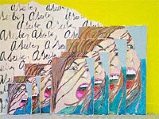 Hay una puerta que es un cuadro y resultó de querer llevar a la pintura un ejercicio de Le Corbusier, quien recomendaba a sus alumnos ir probando en dónde quedaría mejor la puerta en un plano. La puerta-cuadro, que se llama Puerta-ejercicio, se puede ir moviendo por el espacio, está entreabierta y apoyada en el piso. La Odalista, otra de las obras, es el rostro de una mujer de grandes ojos ataviada con un tocado; nos mira embozada por una tela sin pintar, que como objeto real cubre la mitad del cuadro, velándolo a medias. También vuelve una pintura que estuvo en esta misma galería en el ‘96 y que quise incluirla porque me resultaba irresistible ver cómo el tiempo la había afectado, es Mujer pancho... Después está la serie de siete pinturas que conforman un solo trabajo y que son la misma imagen en distintos tamaños de una mujer gritando. Esta obra va en el piso, apoyada en la pared sobre un wallpaper con firmas mías. Se llama Grrrrito y hay títulos optativos basados en la obra de Clarice Lispector: Ella no sabe gritar o El derecho al grito. Esta modalidad de la repetición en diversos tamaños progresivos, a los que empecé a llamar “progresiones”, surgió con otra serie de obras que muy al principio se llamó Sobre la perspectiva y enseguida pasó a llamarse Intimidad y valor. La imagen de esta progresión es un cuarto de hotel y son trece obras con la misma imagen –supuestamente la misma imagen–, que va de muy pequeña a bastante grande (6x10 cm a 14x120cm).