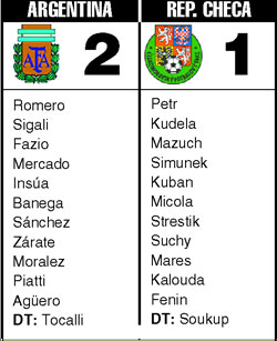 El primer período había sido parejo, pero en el segundo Argentina asumió el control del juego y empezó a arrimar peligro. Sin embargo, los europeos se pusieron en ventaja en una llegada aislada. Los pibes argentinos encontraron una rápida respuesta con el empate de Agüero y fueron por más. El partido lo liquidó Mauro Zárate con un derechazo bajo. El arquero checo reaccionó tarde y la pelota se le metió en el primer palo. No hubo tiempo para más.