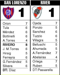 Un tiempo para cada uno. El primero para San Lorenzo, que se puso en ventaja con un cabezazo de Silvera. El segundo para River, que mejoró con algunos cambios posicionales y empató con un penal a puro amague de Ortega. El 1 a 1 le quedó bien al partido, que se cerró con la expulsión de Belluschi.