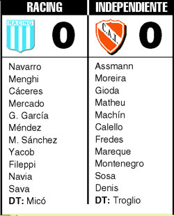 Racing aparecía desconectado. Las dos líneas de cuatro que dispuso Micó le otorgaban cierta garantía en la zona defensiva, pero le quitaban toda posibilidad de armar juego, sobre todo por lo apagados que lucían Méndez y Fileppi. Por eso, la única alternativa para atacar estaba limitada a pelotazos a dividir para Sava, fórmula que funcionó sólo una vez y terminó con una media vuelta de Navia que controló bien Assmann. Por el contrario, pese al trámite parejo, por el peso de sus individualidades, Independiente arrimó más peligro, como una volea de Montenegro que controló Navarro o una entrada de Sosa que también terminó en las manos del arquero.