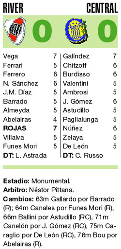 Central –que pensó siempre en el empate como un resultado imprescindible para salir de la incómoda situación de cola, después de las derrotas contra Racing y Tigre de las dos primeras fechas– hizo su negocio. Cuffaro Russo metió mucha gente del medio hacia atrás y, en gran parte del encuentro, limitó sus posibilidades a un remate de media distancia o a alguna jugada de pelota detenida. Sin embargo, en la última parte también dispuso de algunas jugadas como para convertir. Un par de remates desde lejos, en especial uno de Núñez, hizo lucir a Vega. El buen arquero de los dueños de casa también mantuvo su arco invicto gracias a un cruce de Ferrero en una entrada a fondo de Núñez. Hubiese sido injusto, claro, porque Central no merecía tanto. Los hinchas de River tampoco se merecen tanta desilusión.