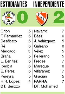 Nunca Independiente fue mejor que Estudiantes. En todo caso fue más práctico. Mohamed armó un equipo corto y cauteloso. Con mucha gente puesta por detrás de la línea de la pelota y el que un solo recurso (el intercambio posicional entre Villafáñez y Parra) le bastó para quebrar la defensa lineal que intentó Estudiantes. La pasó mal en el arranque de los dos tiempos y sobre todo en el del segundo, cuando Hilario Navarro le tapó dos pelotas en la misma jugada a Enzo Pérez y Parra salvó de cabeza sobre la línea un cabezazo de Desábato. Luego se recompuso, se montó sobre las vacilaciones de Estudiantes para crecer y explotó a fondo las pocas oportunidades que tuvo. Suficiente para ganar.