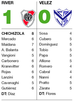 El mayor problema que viene mostrando River es que se retrasa unos metros cuando consigue la diferencia, y le permite a su adversario salir de su campo y posicionarse más adelante. Vélez tuvo así algunas situaciones para llegar a la igualdad, pero el buen presente de Chichizola, quien reemplaza al lesionado Barovero, se lo impidió. El arquero respondió ante una entrada de Allione y otra de Pratto, en las acciones más claras de los de Liniers.