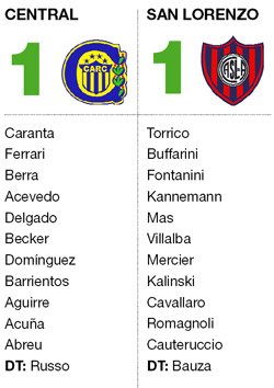 San Lorenzo rescató ayer un punto en su visita a Rosario Central, al igualarle 1-1 en el Gigante de Arroyito con una deslucida actuación, que dejó en evidencia la continuidad de su crisis futbolística tras consagrarse en la Copa Libertadores. En un primer tiempo pésimo del equipo de Edgardo Bauza, el defensor Lucas Acevedo abrió el marcador para los locales, de cabeza, a los 30 minutos, y Juan Ignacio Cavallaro consiguió la definitiva igualdad a los 44, con un derechazo rasante. Con el empate, San Lorenzo abandonó transitoriamente el último puesto con 4 unidades, una por encima de Quilmes, que recibirá hoy a Arsenal de Sarandí. Central, por su parte, quedó con 10 puntos, tras acumular el segundo partido sin ganar en Rosario.