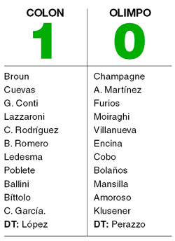 Colón ganó por primera vez en el campeonato al superar a Olimpo y volvió a sumar de a tres puntos luego de cuatro meses. El gol del conjunto santafesino lo convirtió Braian Romero. El encuentro estuvo detenido diez minutos por un corte de luz. El conjunto dirigido por Walter Perazzo continúa sin ganar en el certamen y no festeja un tanto desde hace 432 minutos. En un partido parejo, sin volumen de juego pero disputado con intensidad, el equipo local fue más ambicioso. El mediocampista Romero avisó en la primera mitad y a los 60 minutos, tras una guapeada, definió con clase frente a la salida de Champagne. Ni la desventaja ni el encendido de las luces, tras el corte, pudo despabilar al conjunto bahiense.