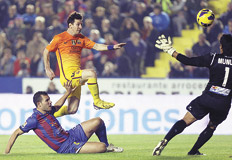 Lionel Messi (foto) sumó dos nuevos goles en la victoria del líder e invicto Barcelona sobre Levante por 4-0 y quedó a tan sólo tres tantos del record del alemán Gerd Müller como máximo anotador histórico en un año. Por su parte, el escolta Atlético Madrid, conducido por Diego Simeone y que se encuentra a tres puntos de la punta, obtuvo el mismo resultado ante Sevilla. Radamel Falcao marcó el primero. Además, Espanyol perdió ante Getafe 2-0, resultado que compromete la continuidad de su técnico Mauricio Pochettino. El conjunto catalán se encuentra en la última posición de la tabla y se retiró silbado de su estadio. A su vez, el