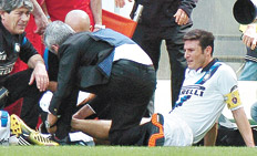 Con tres tantos de Daniel Osvaldo y uno de Erik Lamela, Roma logró una aplastante derrota sobre Siena. Inter cayó en su visita ante Palermo, aunque la verdadera mala noticia para el equipo de Turín fue la lesión de su capitán, Javier Zanetti, que tras un choque con un defensor rival sufrió la rotura del tendón de Aquiles de su pierna izquierda (foto). Bergessio aportó un tanto para Catania, pese a que el equipo siciliano, con seis argentinos desde el arranque, no pudo con Milan. El líder, Juventus, venció como visitante a Torino; y Sampdoria, con Romero, Maxi López e Icardi perdió por goleada frente a Fiorentina, que tuvo a Gonzalo Rodríguez desde el inicio.