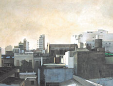 Julio Racioppi dejó su testimonio en estos extendidos paisajes urbanos, en que los autos y la gente eran citados pero no como el centro de su imagen, sino como actores esporádicos y móviles entre grises edificios salpicados con llamadas cada tanto de color.