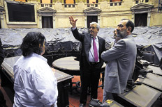 El recinto está siendo reequipado a la vez que se lo restaura. La idea de respetar el lugar hace que las nuevas cámaras de alta definición se hayan montado con delicadeza reaprovechando perforaciones en el muro de mármol ya hechas. Hasta los brazos metálicos que sostienen los aparatos fueron pintados imitando a la perfección el tono del travertino. El viejo sistema de calefacción del enorme ámbito, una tunelería en la que hay tramos por los que se podría caminar, está siendo reutilizado para pasar la masa de cables de los equipos actuales: cada diputado tiene una laptop a conectar en su banca.